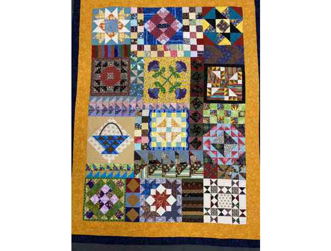 Bright, scrap quilt size 72" x 55". Pieced together over a year and machine quilted locally.