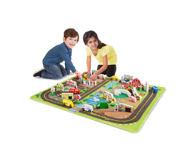 Create a world of adventures, from a bustling town to a busy barnyard! This deluxe play set includes a soft and durable machine-washable activity rug, and 49 wooden play pieces to bring it to life. Pieces include construction vehicles, cars and trucks, play people, buildings, farm equipment and structures, animals, traffic signs, and more! The soft 39-inch by 36-inch (100 cm by 91 cm) rug with skid-proof backing and reinforced border binding has room for multiple kids to play. Countless imaginative adventures await!