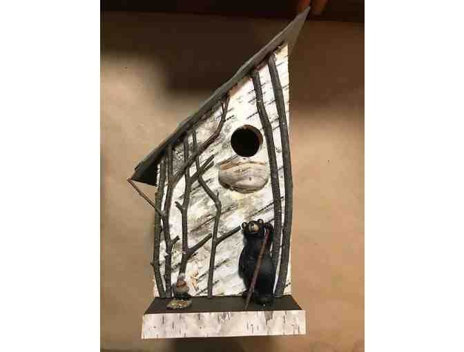 Adorable birch-bark birdhouse with a black bear figurine and stone cairn on the stoop. Add some whimsy to your yard.