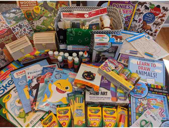 The ultimate at-home kid's activities basket! Enough activities for 2 or more kids. Stacked full of paint activities, stickers, sand art, coloring and activity books, stained glass, playdoh, and SO MUCH MORE!