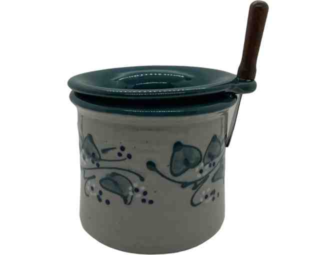Hand painted dip bowl with matching crock for serving chilled dips. Ice can be placed in the bottom section to keep dips cold. Comes with spreading knife.