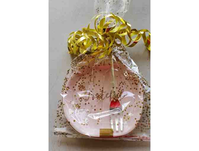 Tapas glass olive tray with serving fork. Color - "Blush Pink" and reads "Grateful" on the tray.