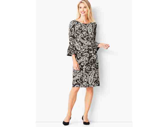 Whether dressed up with pumps or styled casually with flats, this flounced-sleeve shift dress is the perfect combination of pretty and polished. Shift dress silhouette. Three-quarter flounce-detailed sleeves. Invisible back zip; jewel neckline. French and back waist darts tailor fit. Imported.