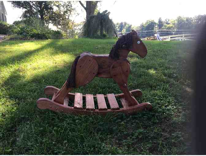 Handmade solid oak small rocking horse made from repurposed NVTRP fence boards. 30.5" long, 16" tall to the seat. In person pickup, cannot be shipped.