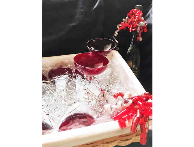 Gift basket with a bottle of Prosecco and 6 vintage ruby red antique champagne/sherbert glasses.