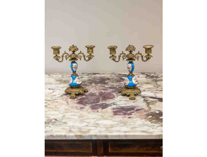 Pair of French bronze-and-porcelain two-branch candelabra with robin's egg-blue background and floral decoration 11" high, As Found