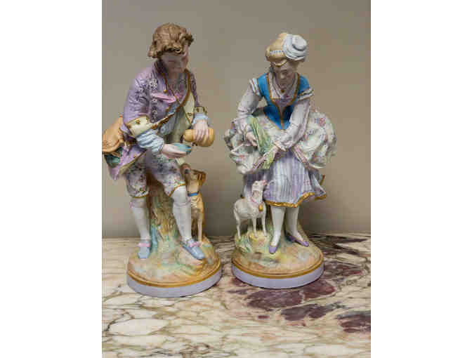 Pair of bisque-porcelain figures of a man and woman; the man is pouring water for his dog at his feet and the lady wears a long dress and has a lamb standing at her feet 21" high