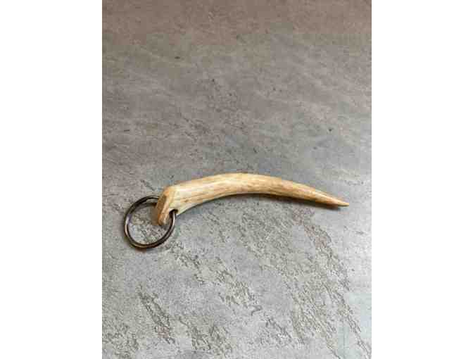 Keep track of your keys with this authentic key chain. Antlers are white tail sheds that have been designed, cut, sanded, and polished all with care by Ripton resident Bucky Doria. 4'' long with a 1'' ring.