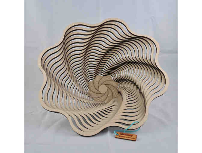 This basket bowl is made from Baltic birch plywood, laser-cut into a mesmerizing pattern. Durable and eye-catching, this bowl can be used for fruit or bread or as a decorative table centerpiece. The bowl measures approximately 15 inches in diameter.