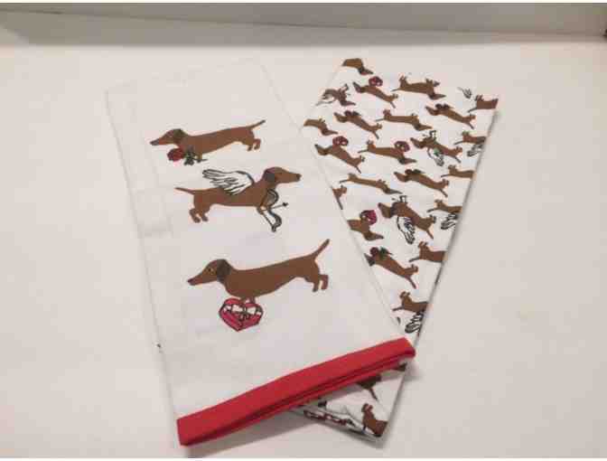 Love is in the air for the doxies! Adorable set of two dish towels with a Cupid doxie, Doxie with heart shaped candy box, and one with a red rose. Multi doxies on the other towel. Sooo cute!