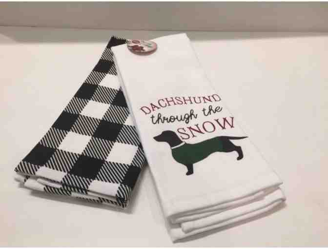 Dachshund through the SNOW dish towels. One black and white plaid. One white with doxie in a green sweater ... dachshund through the SNOW.