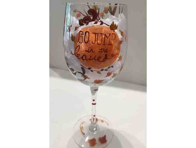Fall themed wine glass ..."Go Jump in the Leaves". Holds 16 ozs. WOW! Hand-painted. This is truly a unique piece with amazing detail!