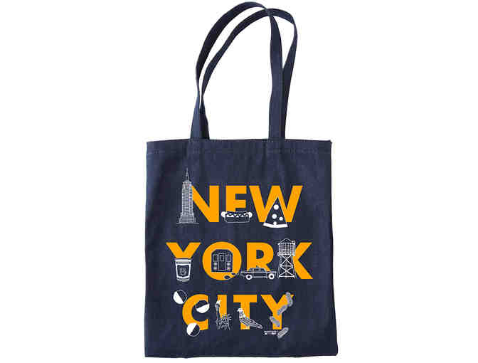 This durable and stylish denim tote bag wears well over time and has a handy inside pocket. Makes for a unique and practical souvenir featuring bold text and icons representing New York, New York.