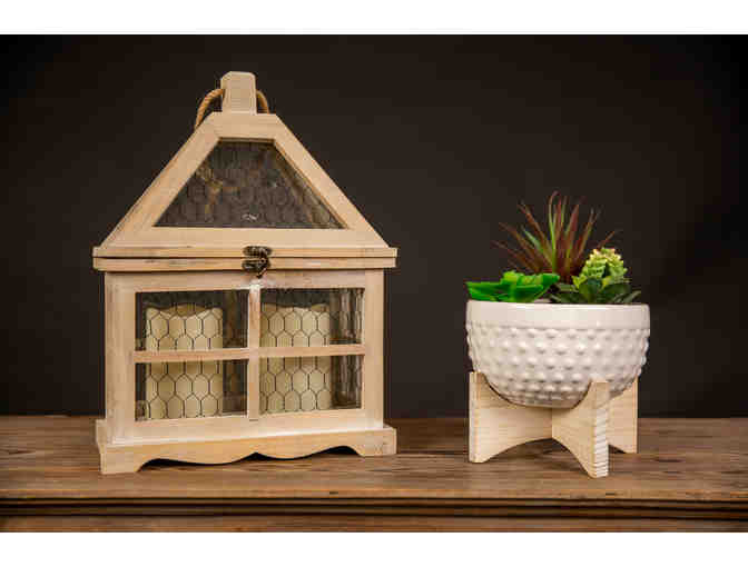 Blonde wood Decorative Lantern with artificial succulent that has matching blonde wood base.