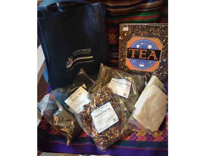 A Tale of 3 Teas! - From Atlantic Spice Company – Three bags of fresh loose tea (Blue Eyes Fruit Tea Blend, Classic Earl Grey and DeCaf Sencha Green), 100 individual cloth tea bags & 50 teabags for pots of tea – packaged in an Atlantic Spice Blue cloth shopping bag. The beautiful DK book "The Tea Book; Experience the World's Finest Teas, Qualities, Infusions, Rituals, Recipes" is full of beautiful photos, fascinating and useful information about teas and incredible recipes for tasty hot and cold tea-based drinks!