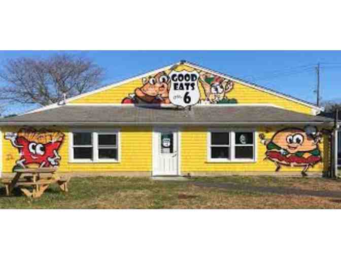 Good Eats On 6 - has an eclectic, fun menu that features Fresh Hand-Seared Burgers, cut-off the cone Gyros, falafel, great NY pizza and more! Enjoy the fun ambiance, friendly service and great prices. It is well worth a visit. Call-in, take-out window, and outdoor picnic table seating.