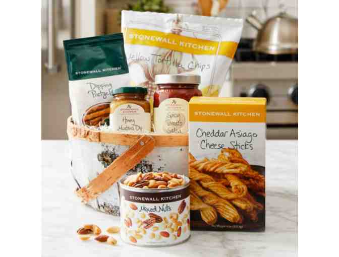 When hunger strikes, reach for this genuine birch basket filled with plenty to munch on -- mixed nuts, salty pretzels, crunchy tortilla chips, cheese sticks, spicy salsa, and sweet mustard dip.