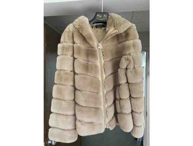 Beige Sheared Rex Rabbit Jacket with Leather Inserts and Hood
