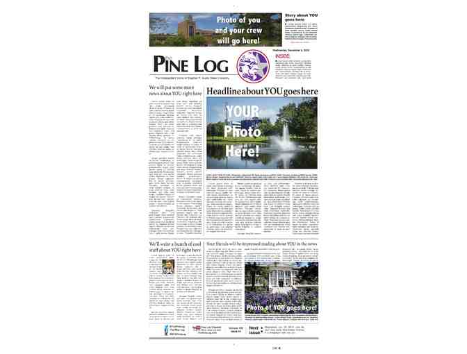Impress your friends and family with an entire newspaper front page featuring YOU! The winner of this auction item will receive a personalized 11" X 17" full-page mock-up of a Pine Log front page suitable for framing for display in your home or office. Purchase for yourself or a friend or family member, perhaps to mark a birthday, anniversary or other special event. Page will be personalized with mock headlines and "news" stories, along with photos of the winner or the recipient, if purchased as a gift.