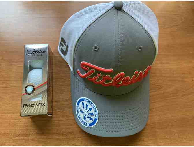 Titleist golf hat & Sleeve of Pro V golf ball.
