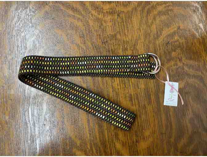 Hand-made adjustable belt with silver d rings, appealing fall colors, made with love by Holly Weber. Belt measures 45" x 1 1/8" and fits through standard jean belt loops.