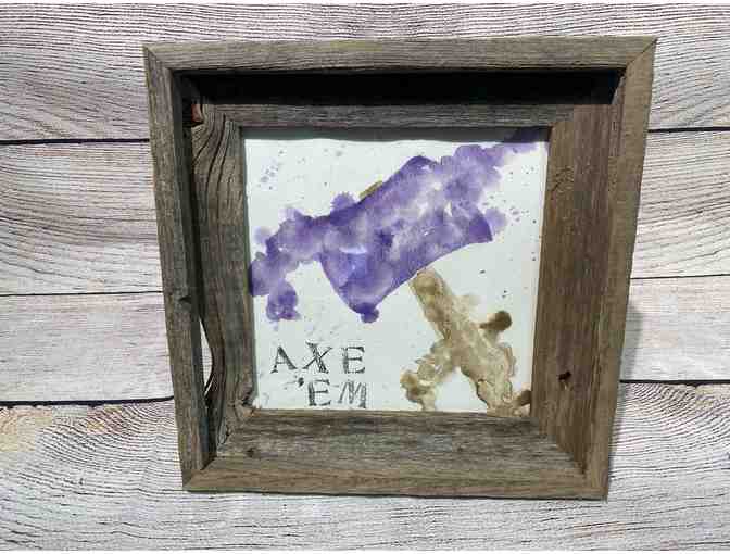 Watercolor of axe blade and handle with "AXE 'EM" by Robin Johnson '99 & '19.