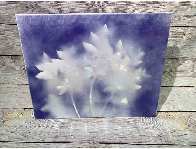Negative space silhouette art with purple paint and Azalea bush on a 16" X 20" canvas. Artwork by Robin Johnson '99 and '19.
