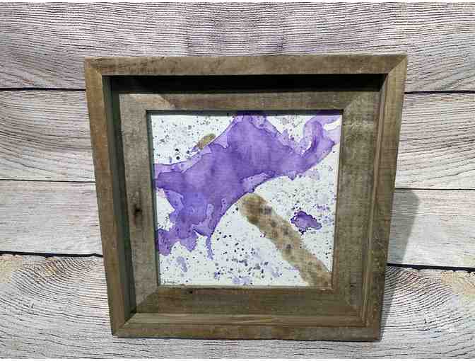 Watercolor of axe blade and handle with purple and silver splatters by artist Robin Johnson '99 & '19.