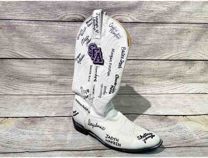 These boots were worn by the SFA Dance Team in 2016 through today. They are signed by the 2019 Dance Team.