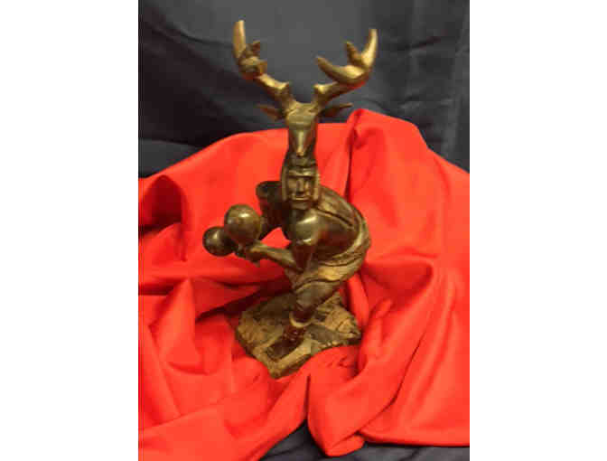 Yaqui Deer Dancer Wood Carving - depicting a sacred Deer Dancer with deer headdress, hand, and leg rattles.