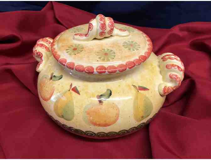 Two and a half quart casserole pot with lid decorated with Italian art style fruit painting.