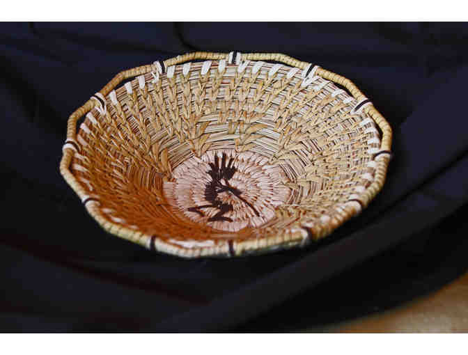A small Tohono O'odham woven basket depicting the fertility god and trickster Kokopelli in the center.