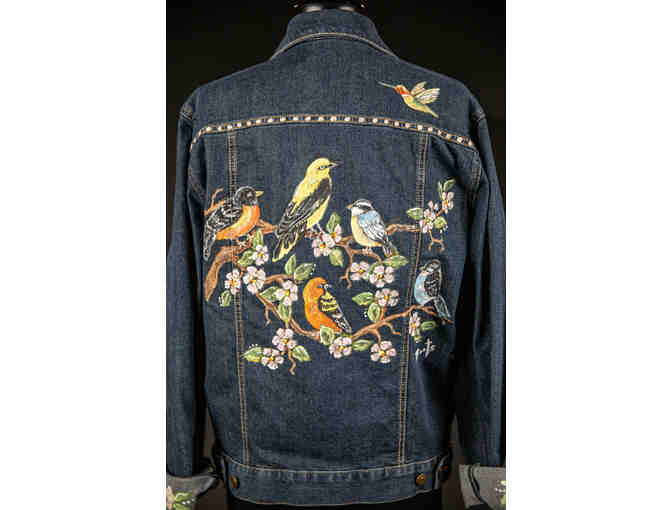 This beautiful jacket was handpainted with love! The jacket is painted with acrylic paint- and has gorgeous birds on the front and back! Size Medium!