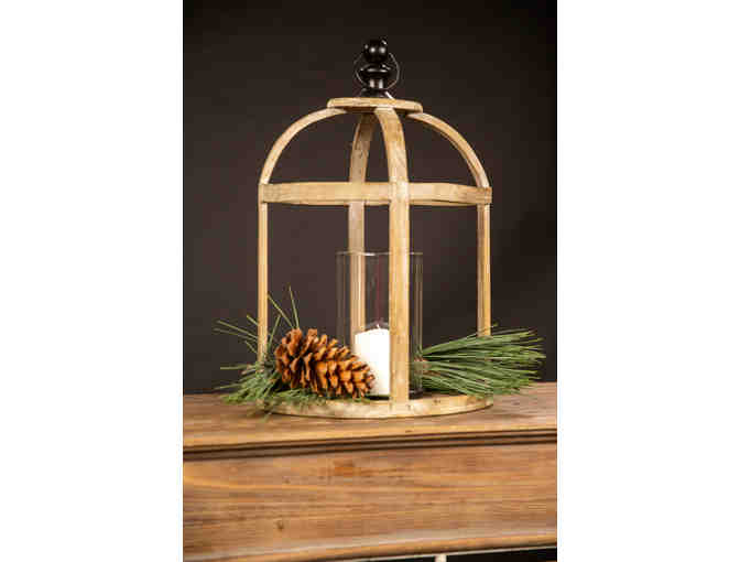 This is a gorgeous blonde wood lantern! Perfect for a table centerpiece, decorating a mantle or on a porch. This lantern is "open air" and you can change accent decor for the season.