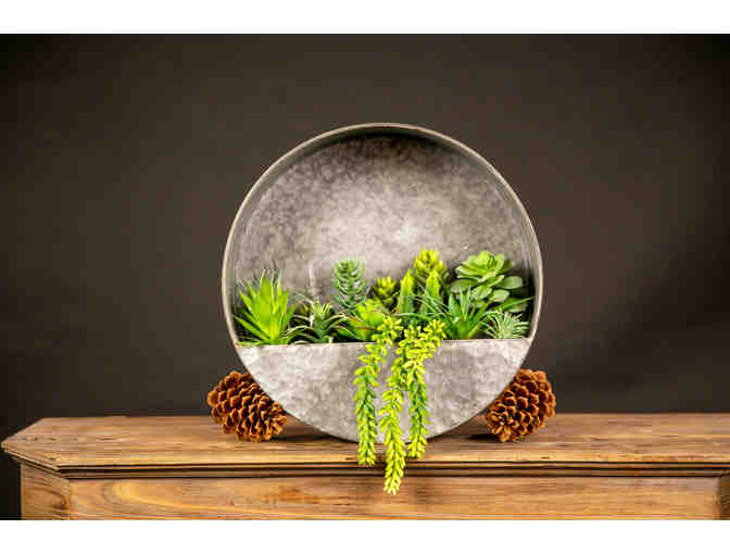 This metal wall planter is filled with artificial succluents. Perfect for home decor!