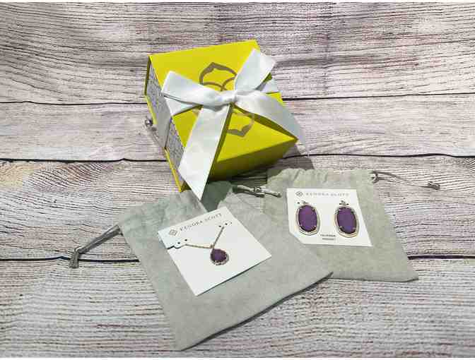 Elle Gold Drop Earrings in purple mica, feather weight, 14k gold plated over brass (1.75" X 0.75")/Macrame Dee Gold Pendant Necklace in purple mica (0.8" X 0.5" on 16" chain, 2" extender).