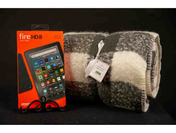 This brand new Amazon Fire HD8 Tablet is paired with a Pottery Barn flannel blanket for a fun gift set!