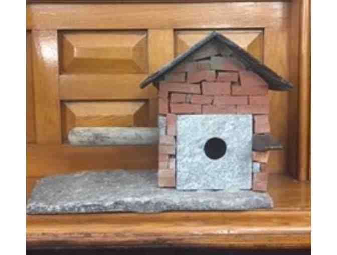 Handcrafted stone bird house made from granite and brick with slate roof.