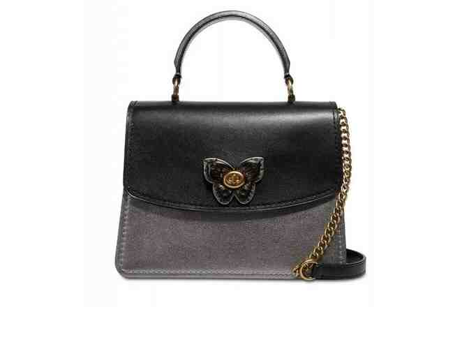 Crossbody Purse Coach 1941 smooth and metallic leather top handle bag with snakeskin sides. Removable chain and flat shoulder strap. Flap top with butterfly turn-lock closure. Exterior, slip pocket at back. Interior, fabric lining.