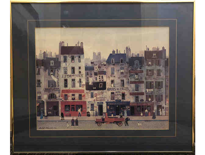 This is a framed and matted print of French painter Michael Delacroix's Au Bon Muscadet. Michel Delacroix is a French contemporary artist, famous for his Paris street scenes.