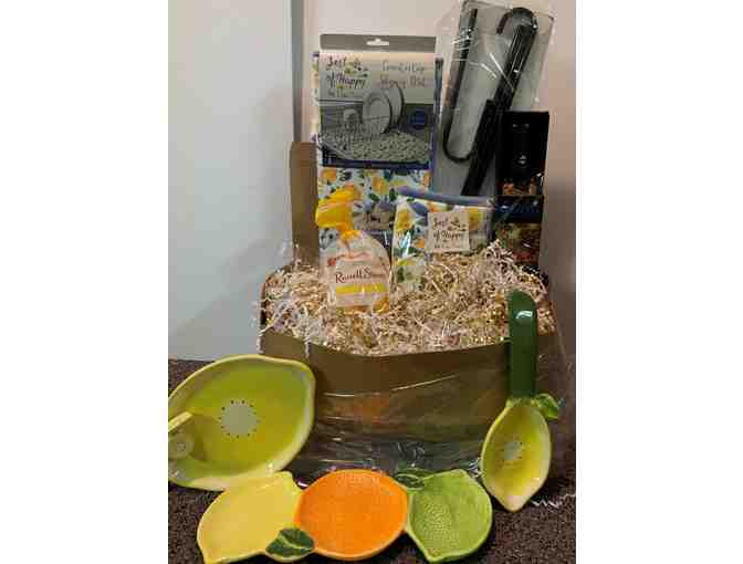 Lemon Lime Themed Kitchen Basket donated by Henry Ford Hospital-West Bloomfield. Basket contains a drying mat, Russell Stover Candy, 2 small serving dishes, spoon rest, umbrella, garden art flag and hanger and oven mitt.
