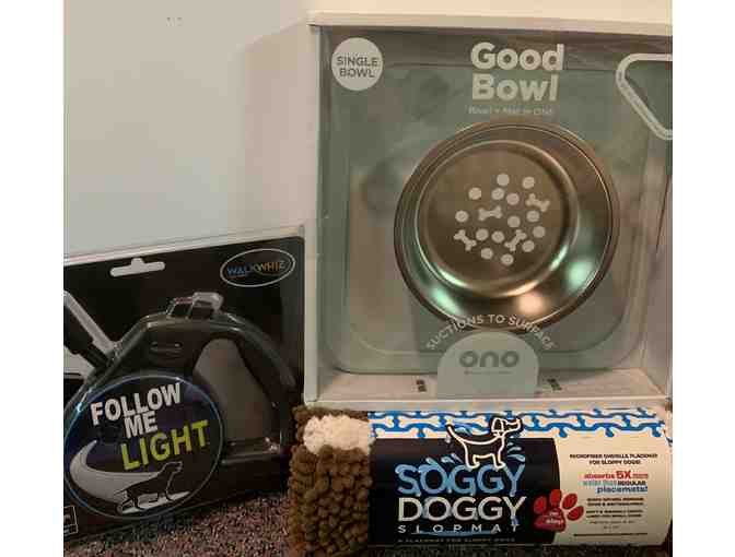 A single dog bowl and mat in one, Soggy Doggy mat and a Follow Me Light Leash