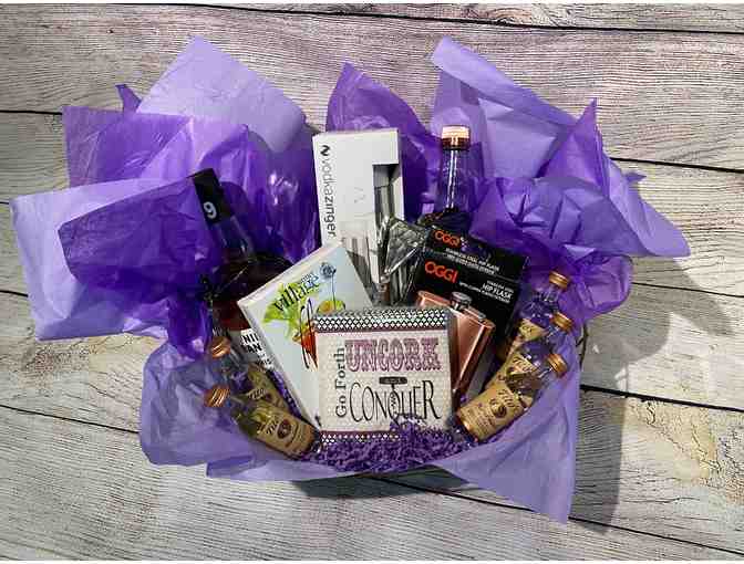 Wire basket filled with 1 Liter of Tito's vodka, 750ml of Nine Banded Whiskey, copper plated stainless steel hip flask, gourmet bloody mary mix, vodka zinger flavored infuser, decorative cocktail napkins, two martini glass charm ornaments, and five travel size Tito's vodka.