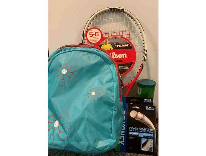 Junior tennis back pack with tennis racquet(5-6 yr old), tennis balls and replacement string donated by Pine Lake Country Club