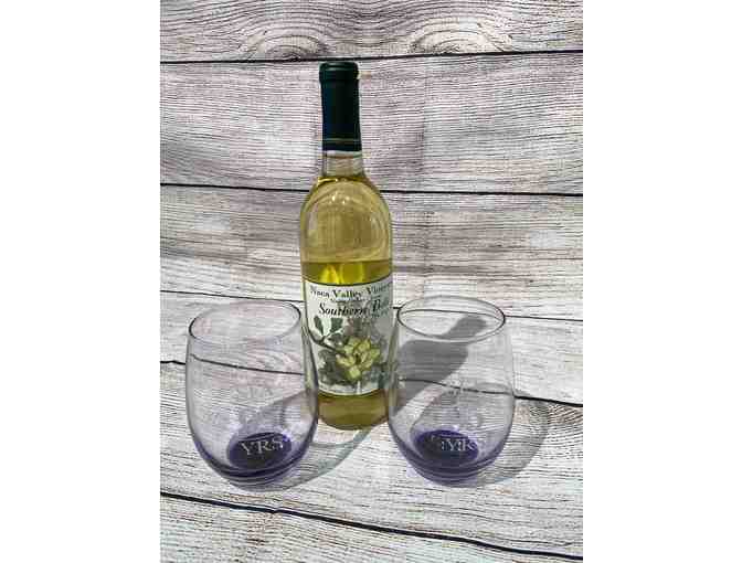 Stemless wine glass set with purple accented base and etched '95th Anniversary' logo as well as 1 bottle of Naca Valley's "Southern Belle" dry white wine.