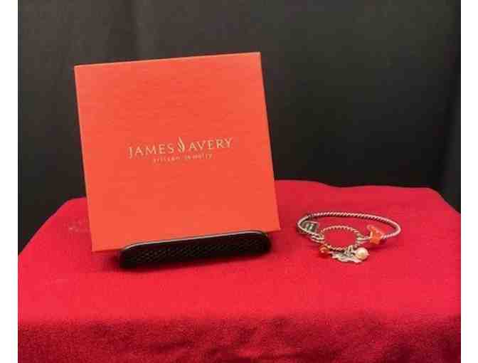 A sterling silver, twisted wire bracelet is attached to one side of the oval and the opposite end hooks on and off. Charms included are: a Razorback, red Carnelian bead, and a pearl bead.