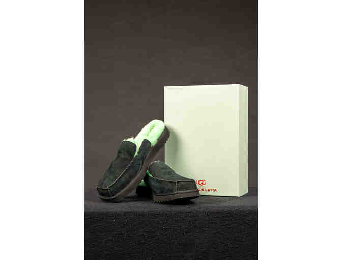 These super cozy and stylish slide are called the UGG ECKHAUS LATTA BLOCK SLIDE (Men's size 10 in Black Suede and Teal Sheepskin)