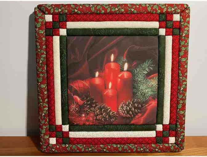 This lovely Christmas scene of four red candles surrounded by ribbons and greenery was handmade by Gloria to hang on your wall or sit in your bookcase during the Christmas season. Around the candle scene are color-coordinated quilting fabrics in Christmas colors arranged in a quilt-like pattern. The piece measures 12 inches square.