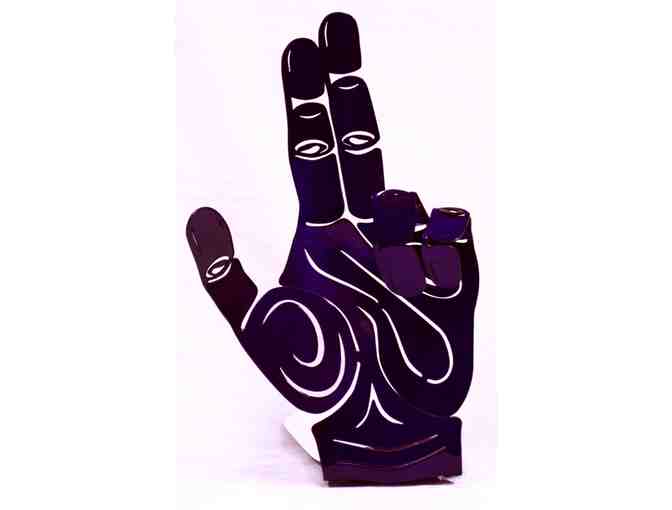 MöTALíF life-size metal art hand “Axe ‘Em” sculpture ‘proudly stands 8′ tall – fully extended. Every MöTALíF sculpture is designed and forged by hand.