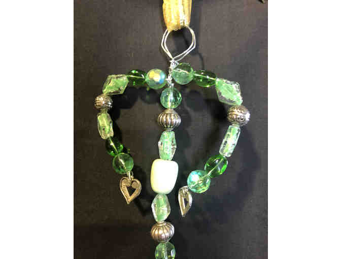 "Have a Heart" bead and stone hanging . Beads and stones are green and white. Silver plated beads. Bottom weight is a heart. Made by Marie Gaskill, a Presidio member and Friday-at-the-Fort Volunteer.